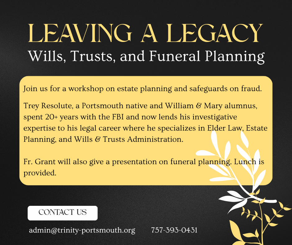 Join Trey Resolute of Oast & Taylor and Fr Grant of Trinity as they present information on planned giving, wills & trusts, and funeral planning. Lunch will be served. There is no cost. Registration is required.